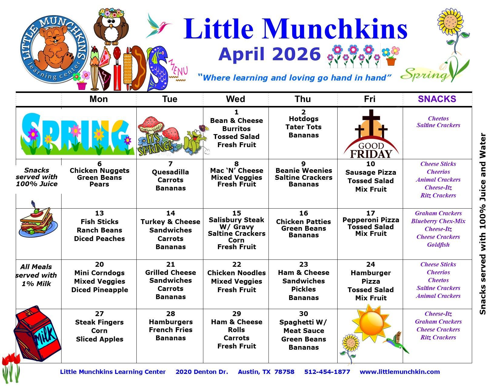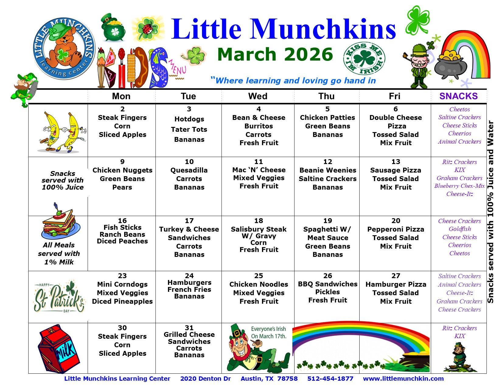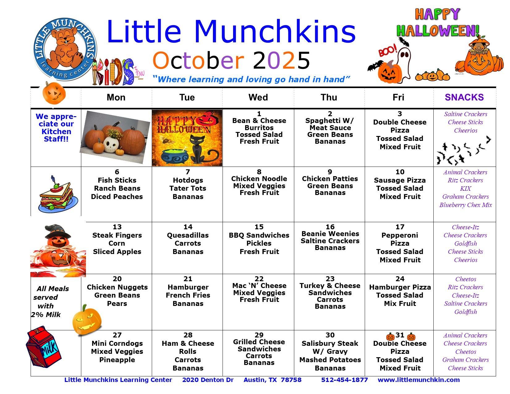 At Little Munchkins Learning Center, your child will enjoy a nutritious lunch with their friends! Take a look at our menu below:
